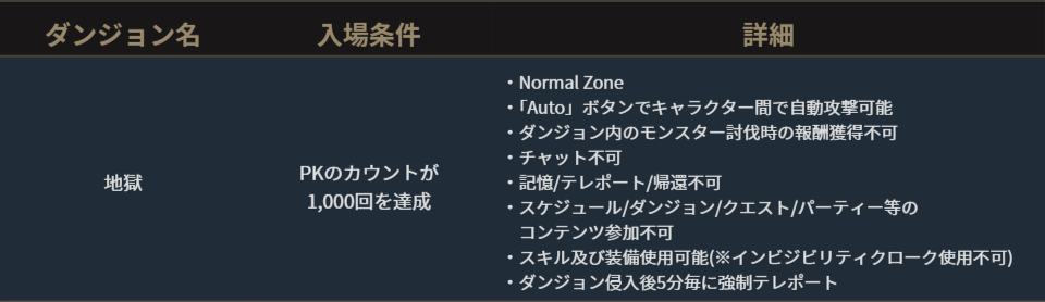 PKのカウントが1,000回を達成すると、強制的に地獄ダンジョンに移動させられます。