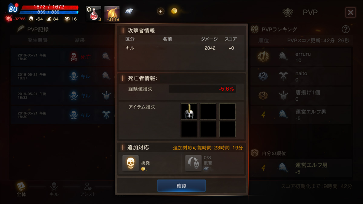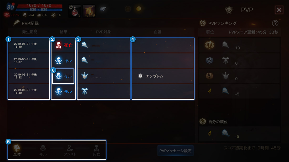 PvPの結果に基づいて記録が追加され、PvP記録メニューで確認することができます。PvP記録メニューでは、発生時刻、結果、PvP対象、血盟、ランキングなど、さまざまな情報を確認することができます。