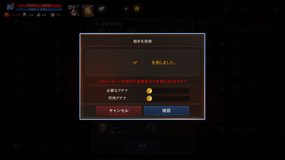 PVP戦闘中に他のプレイヤーを倒した際にアデナを支払い挑発することができます。挑発するとゲームに接続している相手と相手の血盟員や友達のゲーム画面に相手が死亡したことをシステムメッセージで表示することができます。