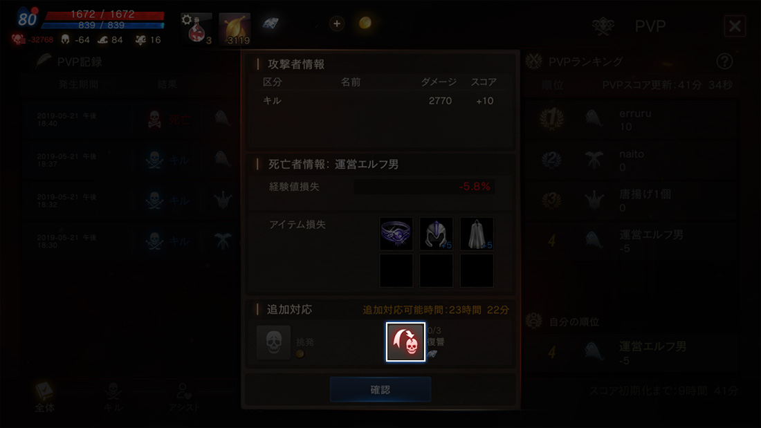 キル:お互いに交戦状態となったキャラクターをキルした場合には、PvPスコアを獲得します。