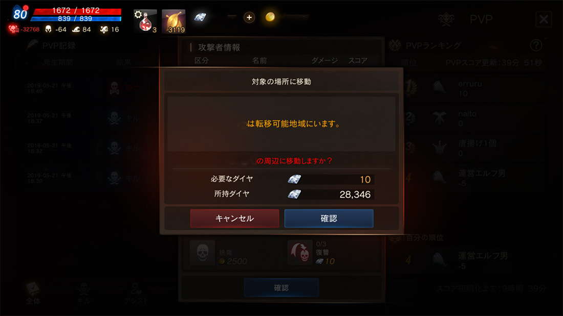 PVPで自分が死亡した場合に、ダイヤを支払い相手のキャラクターの近くにテレポートすることができます。