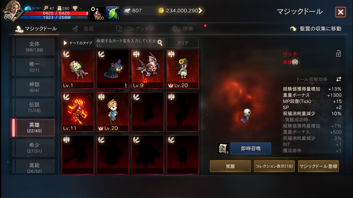 マジックドール召喚とはチュートリアルやクエスト、ガチャなどで獲得した「カード」の力を用いて「マジックドール」と呼ばれる魔法の人形を召喚し、所持重量上限や獲得経験値量増加などの戦闘に有利な要素を強化するシステムです。