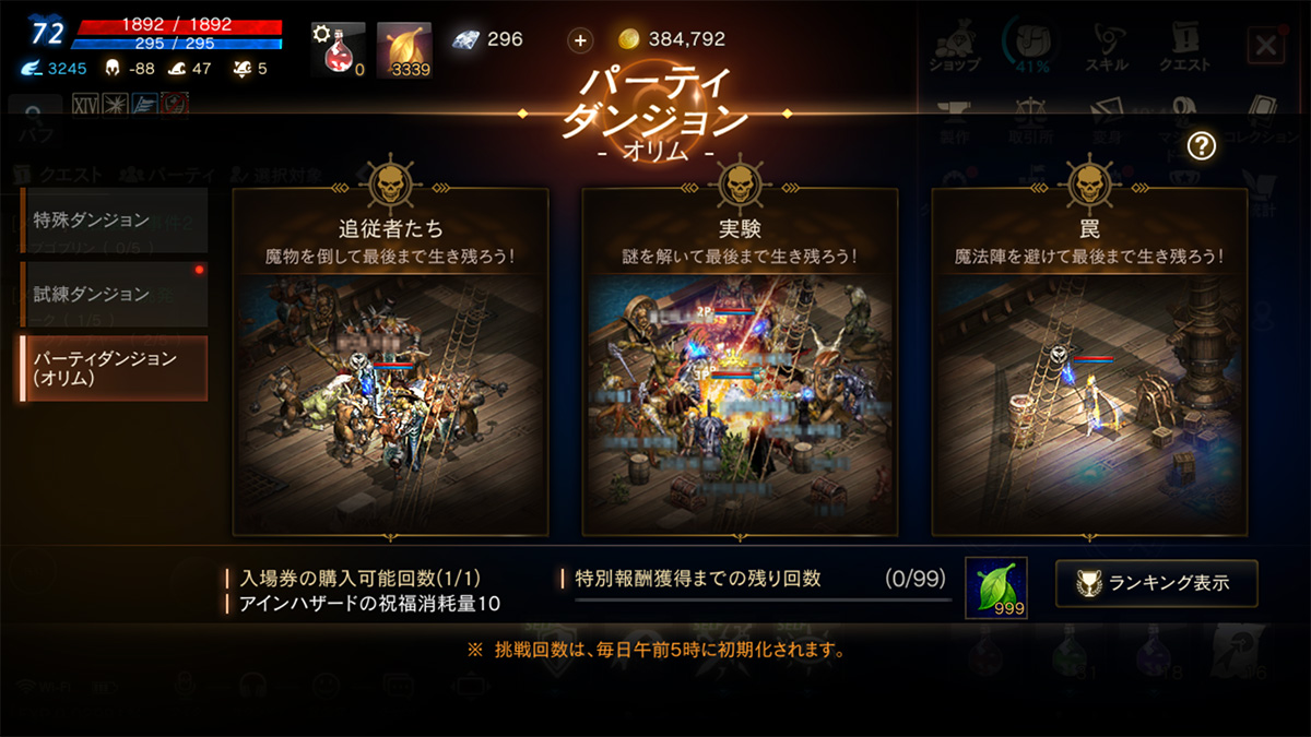 パーティーダンジョン(オリム)は、4人のパーティーメンバーが参加できるインスタンスダンジョンです。「 ”追従者たち“、”実験“、”罠“の3つのダンジョンの一つを選択し、参加します。攻略すると様々な報酬を獲得することができます。