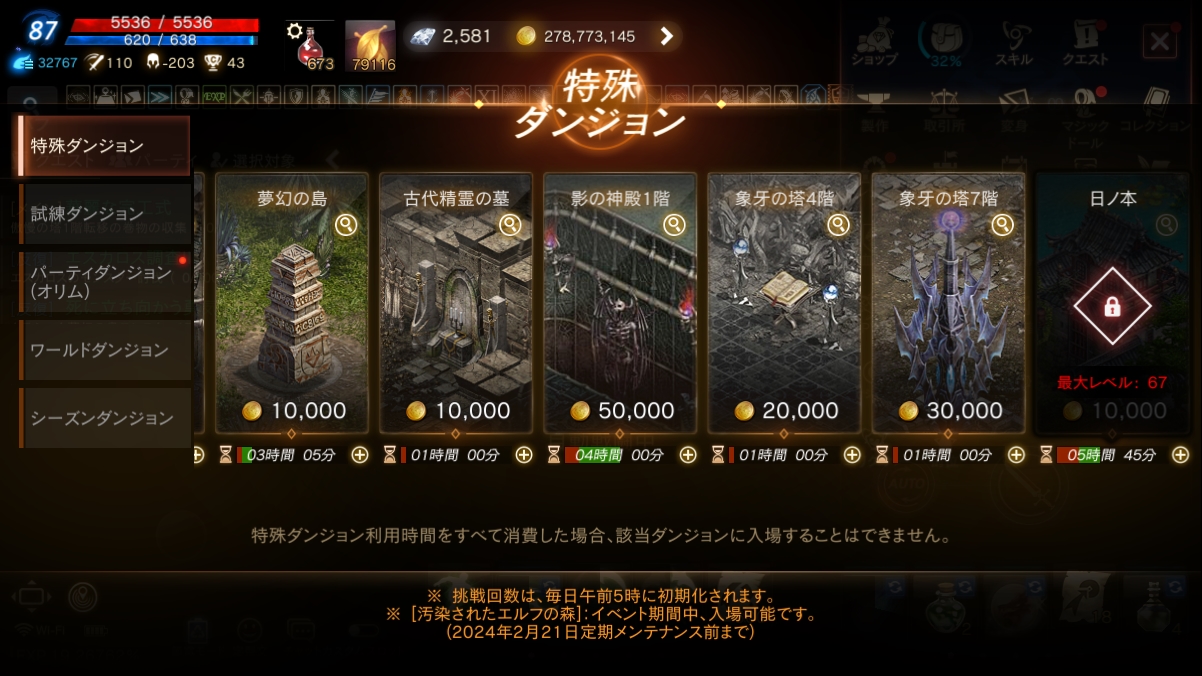 | 日ノ本 | 45以上67以下 | 限られたレベル帯のみしか利用できませんが、非常に経験値の良いダンジョンです。 夜の日ノ本と利用時間を共有しています。 |