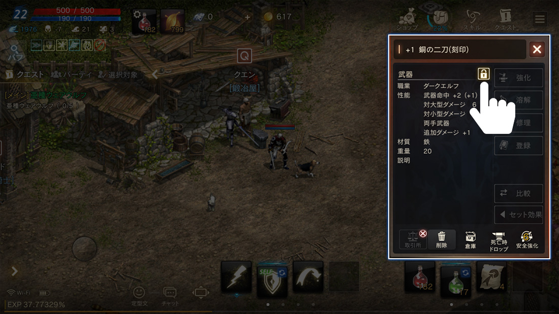 アイテムは、アイテムの詳細ウィンドウのロックボタンを介して「ロック」、「ロック解除」が可能であり、ロック時に削除、強化、製作、コレクション材料に使用できなくなります。 (アイテムをロックしてもアイテムの使用は可能です)