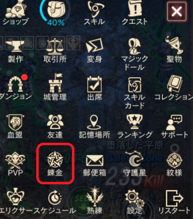 錬金術はメニュー画面の「錬金」より実行できます。