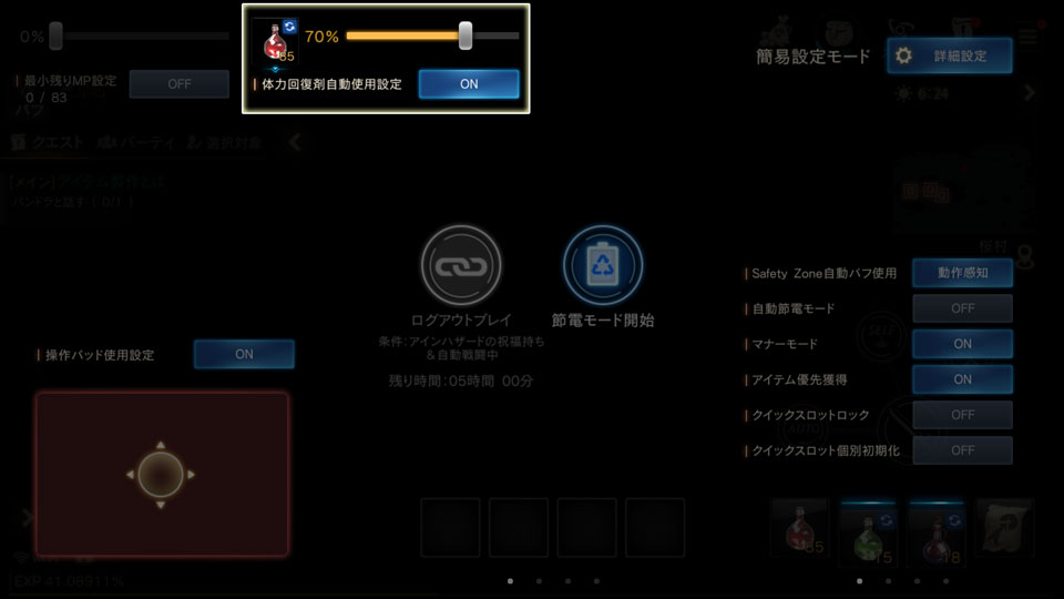 体力回復剤の自動使用は「簡易設定画面」で設定することができます。