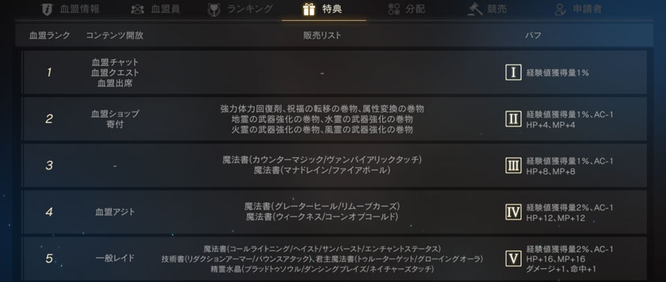 参加している血盟の血盟ランクに応じて、ステータスにバフが発生したり、魔法書などの限定アイテムの購入や、血盟レイドに挑戦することが可能となります。