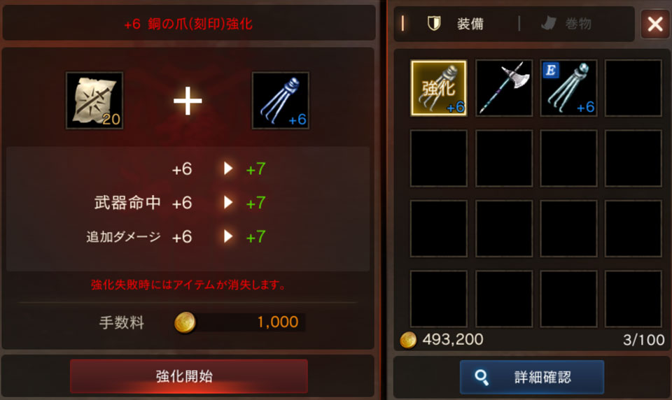 装備の強化には、武器強化の巻物など、装備に応じた強化の巻物が必要となります。