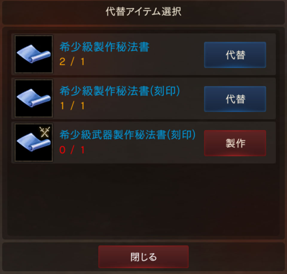 製作に必要な素材は他のアイテムで代替することも可能です。
