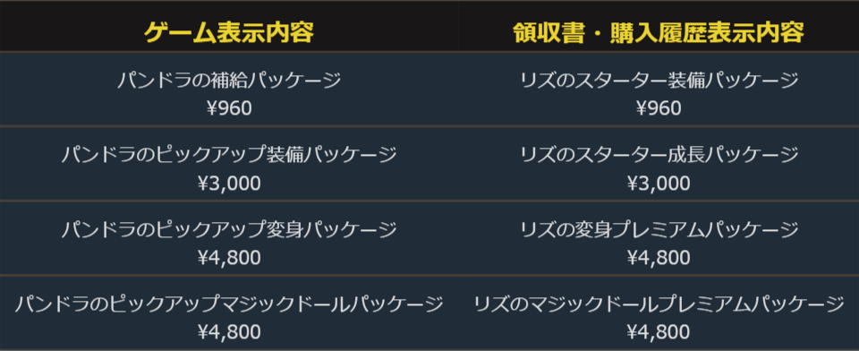「ショップ」にて現在販売している下記の商品について、App Store/Google Playにて発行される領収書、ならびに、購入履歴の表示が、ゲーム内で表示している内容と異なる。