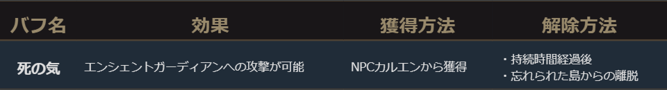 忘れられた島の村にいるNPCカルエン出現時、該当のNPCをクリックすることで攻略に必要な「死の気」のバフ効果を獲得することができます。