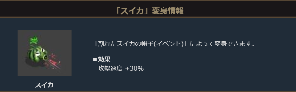 「割れたスイカの帽子(イベント)」を装備することで、「スイカ」に変身できます。