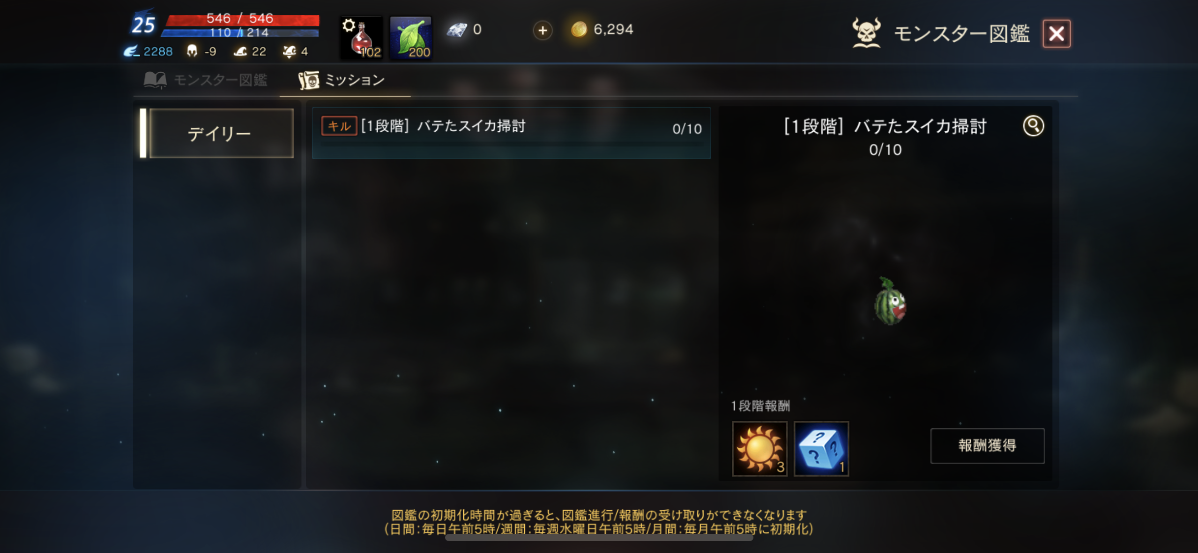 イベント期間中、1日に10回まで、「バテたスイカ」を10体討伐するたびにモンスター図鑑のミッション報酬として「ジリジリする日差し(イベント)」3つとランダム報酬1つを獲得できます。