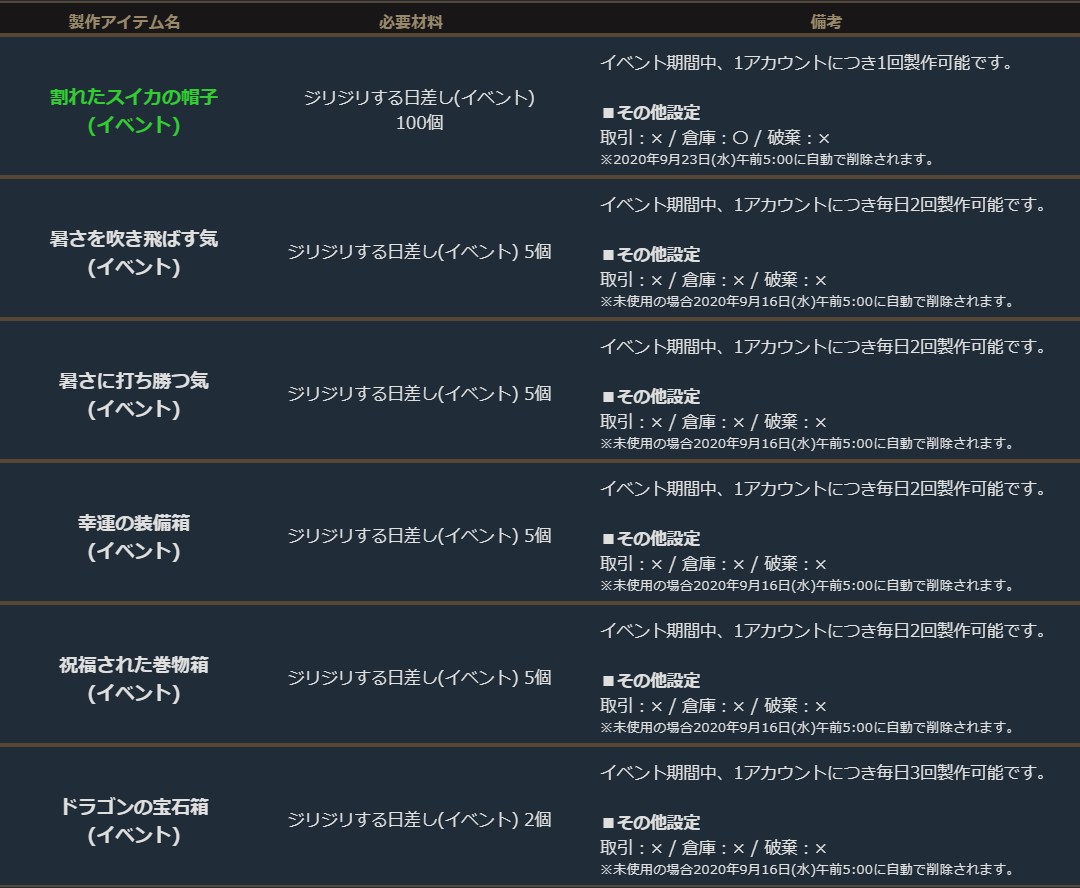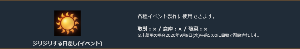 イベント期間中、「ジリジリする日差し(イベント)」を素材として下記のアイテムを製作できます。