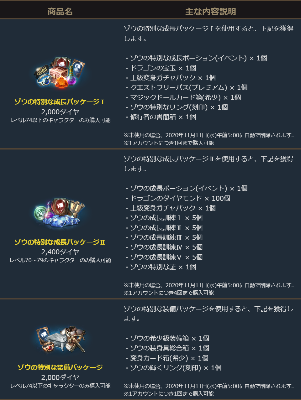 2020年10月7日より、ゲーム内ショップで新規・休眠キャラクターにお勧めな「各種ゾウの特別な成長パッケージ」と「ゾウの特別な装備パッケージ」の販売を開始しました。