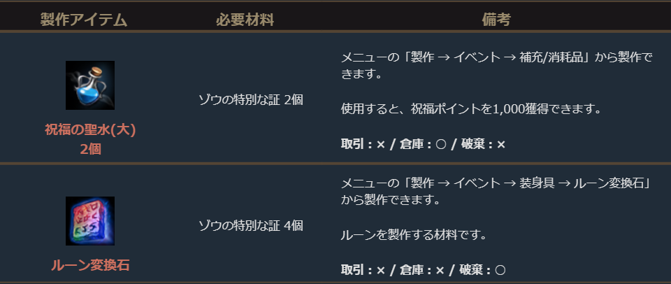 ※製作画面は11月18日5時まで表示されますが、材料となる「ゾウの特別な証」は11月11日5時に削除されるため製作期限にご注意ください。
