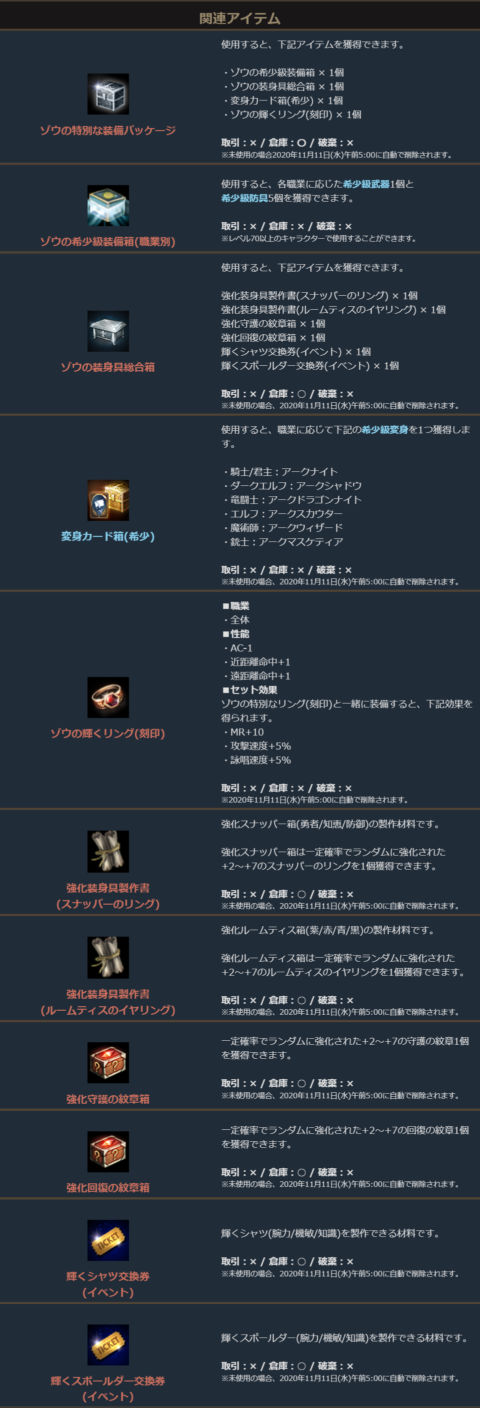 「ゾウの希少級装備箱」から獲得できるキャラクターの職業に応じた装備は下記となります。