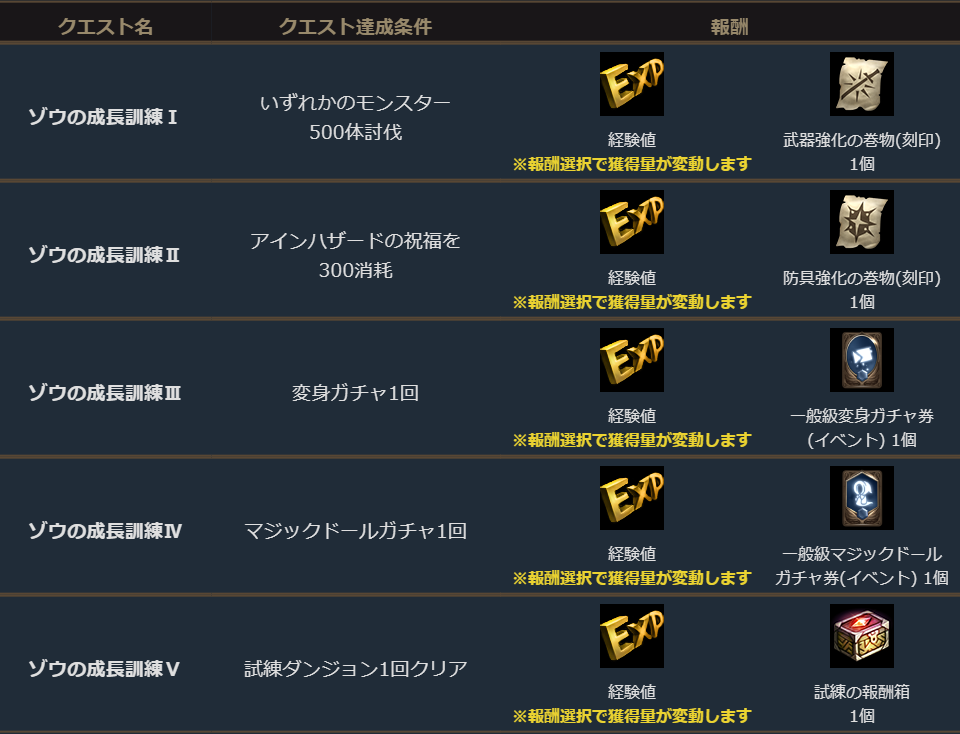「ゾウの成長訓練Ⅰ~Ⅴ」は使用すると専用クエストを受注できます。
