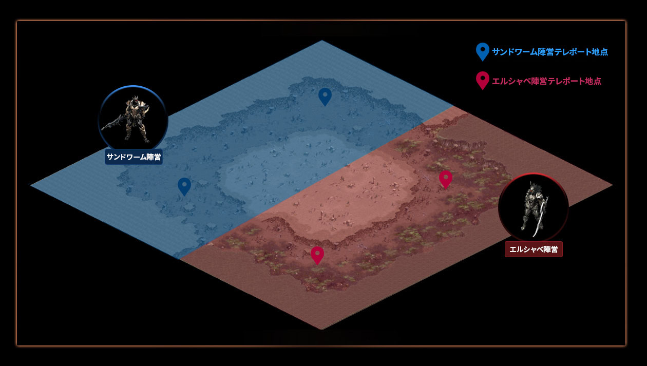 └テレポート時にエルシャベ陣営とサンドワーム陣営に自動で配属され、キャラクター名も一時的にランダムなものへ変更されます。