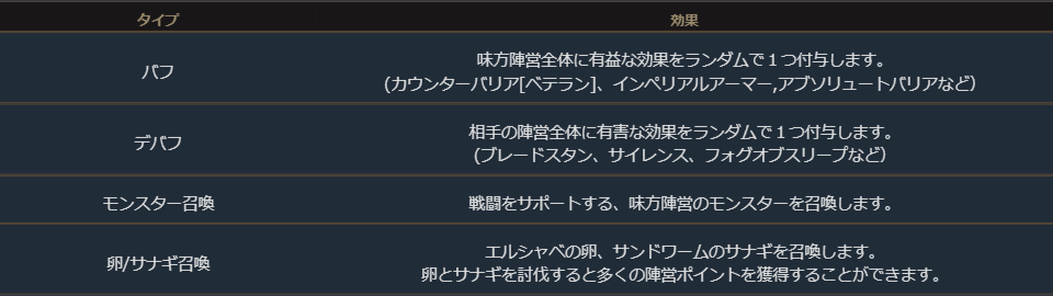陣営ポイントが12,000ずつ蓄積されるたびに、下記4つの中から1つの効果が発動します。