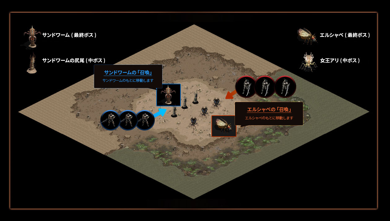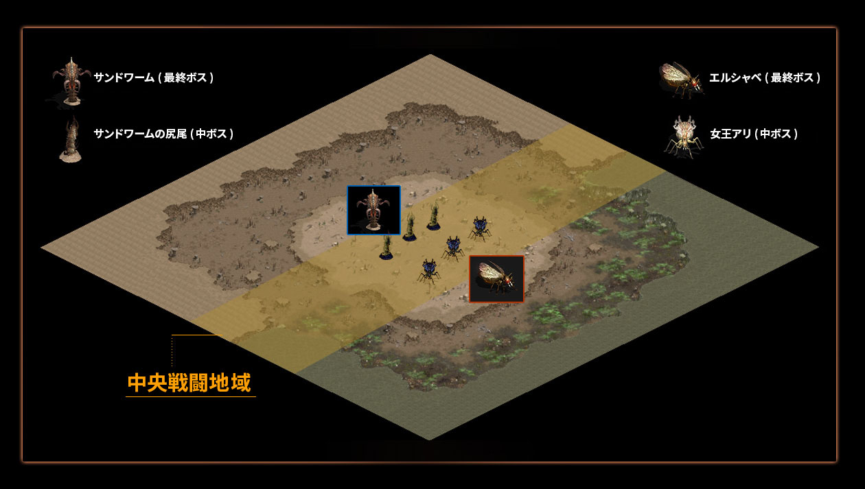 「サンドワームの尻尾」はサンドワームを守護する中ボスで、「女王アリ」はエルシャベを守護する中ボスです。