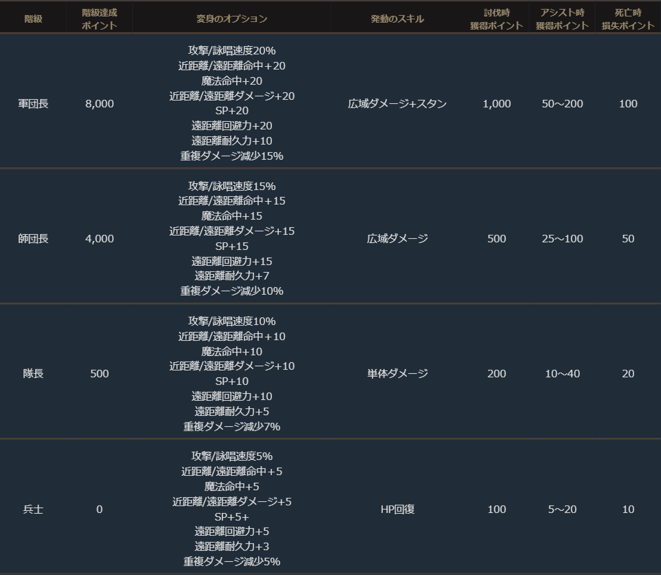 戦闘ポイントはNPCや相手陣営のプレイヤーを倒して獲得することができるポイントであり、獲得したポイントに応じて個人の階級が決定します。