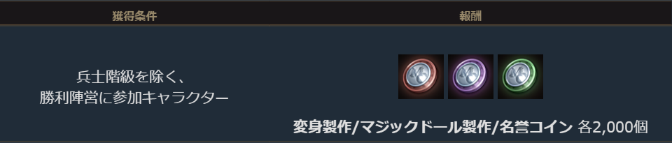 勝利陣営の兵士階級を除く参加キャラクター全員に下記の報酬が郵便で付与されます。