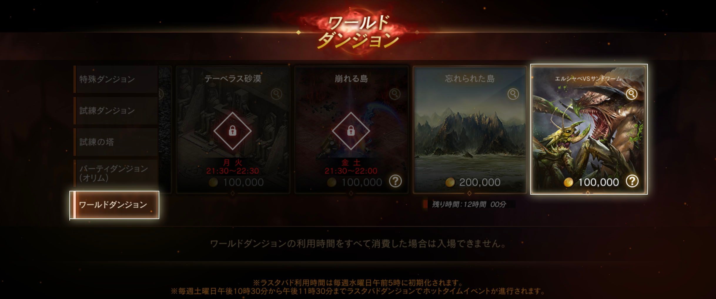 または、「メニュー > ダンジョン > ワールドダンジョン > エルシャベ VS サンドワーム」からレベル75以上のキャラクターで入場できます。