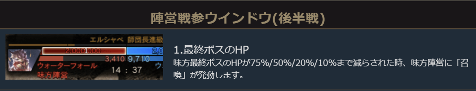 味方陣営の最終ボスのHPが75%/50%/20%/10%まで減らされた時も、味方陣営に「召喚」が発動します。