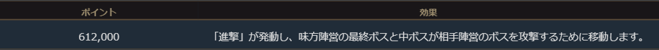 陣営ポイントが612,000になると「進撃」が発動し、味方陣営の最終ボスが相手陣営の最終ボスを倒しに移動します。
