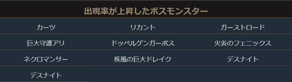 ※今回のアップデートでは、ボスモンスターの強さ、ドロップ、出現周期の変更はございません。