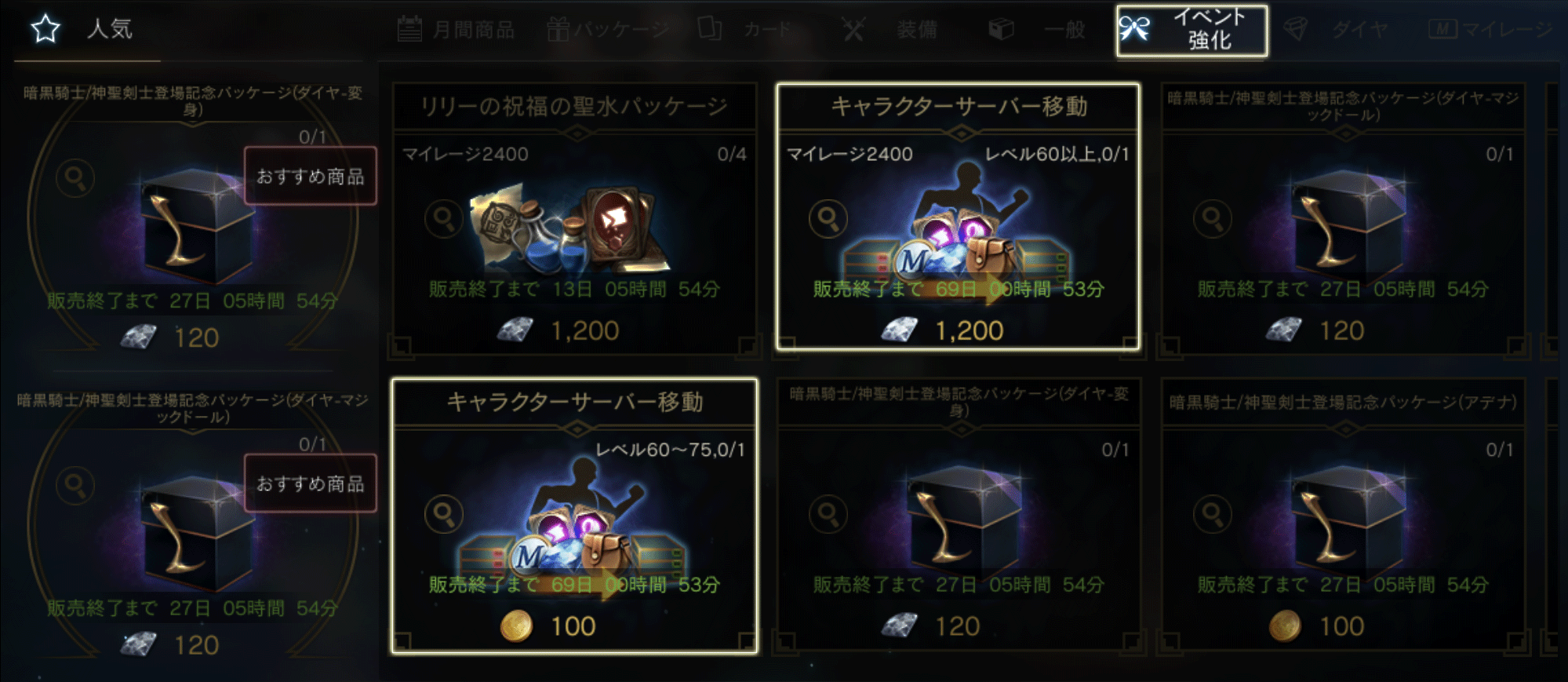 「キャラクターサーバー移動」は2種類あり、100アデナで移動できるサービスと、1200ダイヤで移動できる商品がございます。