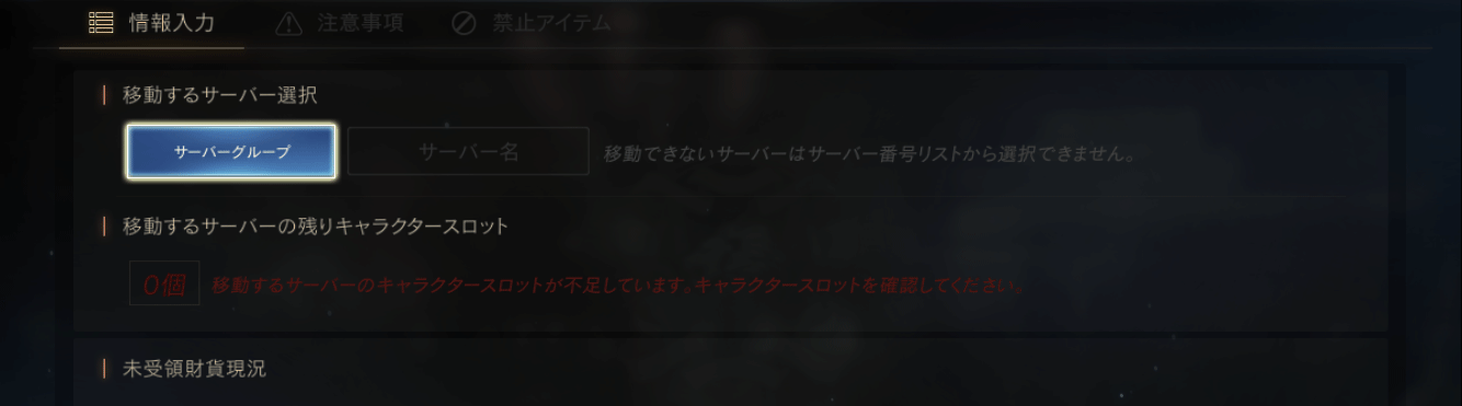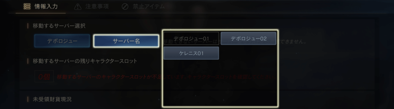 ・移動先に指定したサーバーにキャラクタースロットの空きがない場合