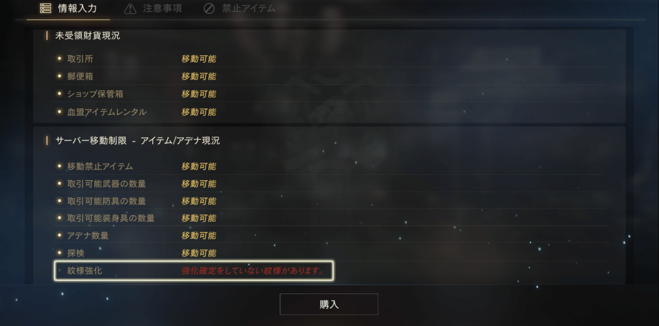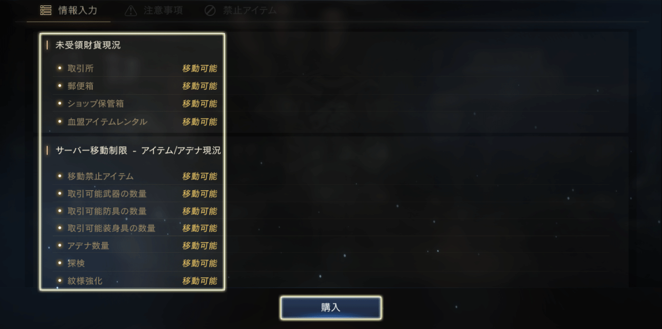 4. 「未受領財貨状況」と「サーバー移動-アイテム/アデナ現況」がすべて移動可能になっていることを確認し、最下部の購入ボタンを押してください。