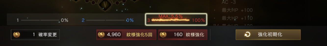紋様強化の強化確率が100%状態になると紋様を強化をするか、強化初期化を行わなければ移動することはできません。