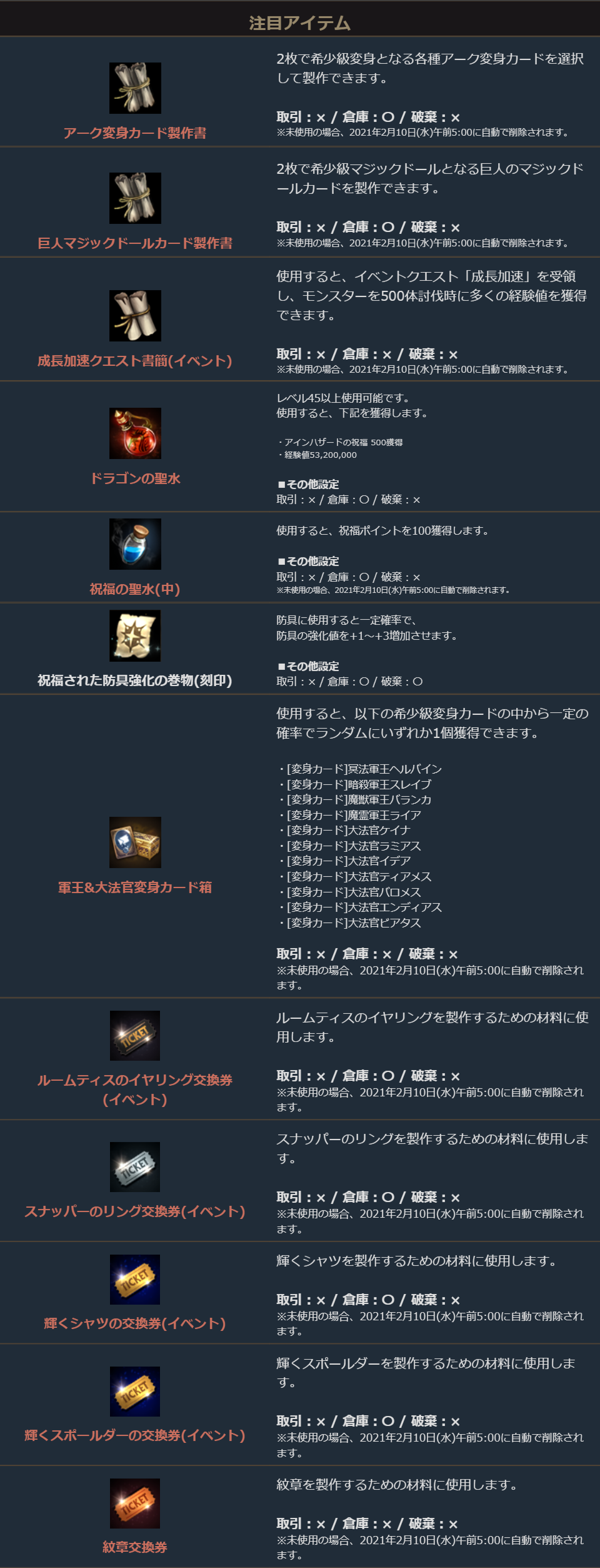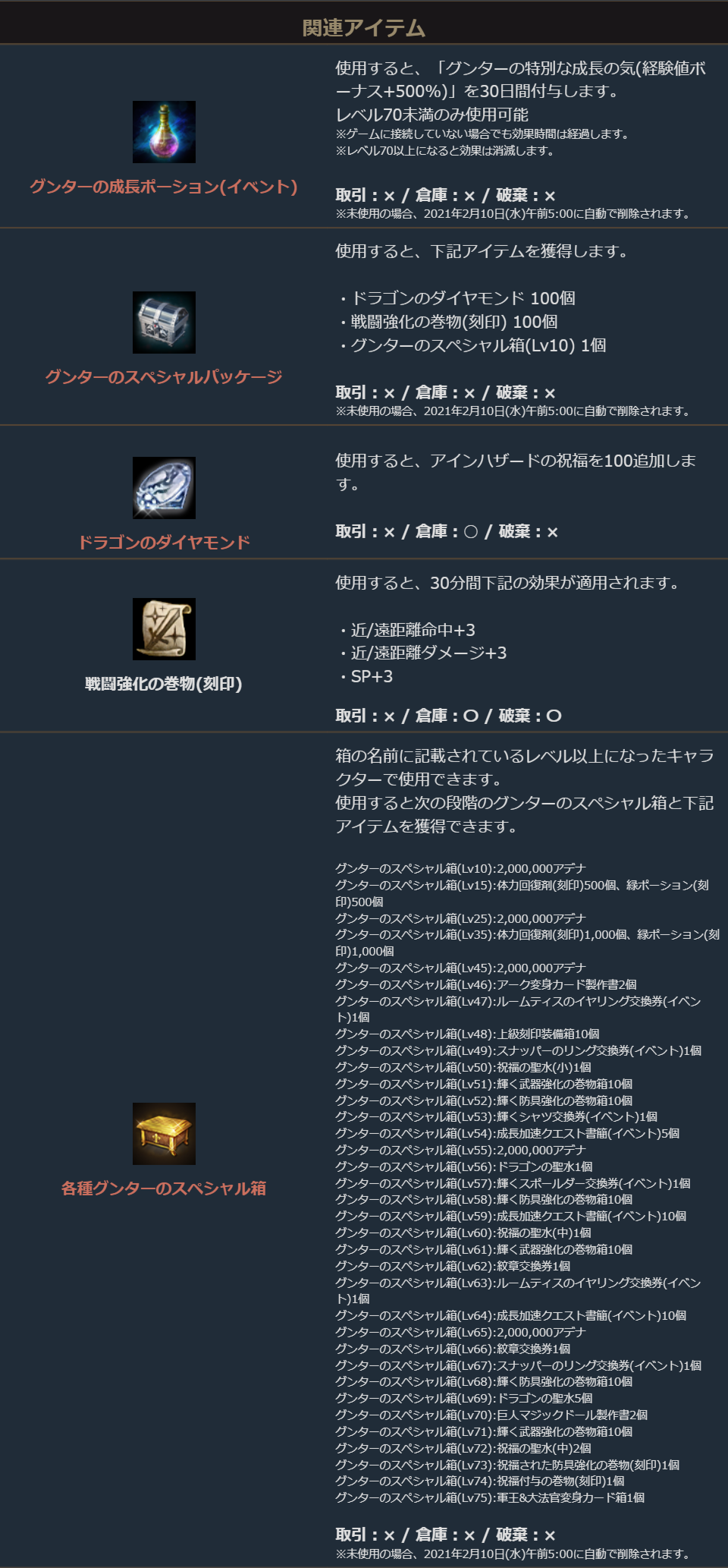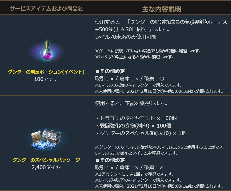 ※期間限定育成サーバー「グンター」のキャラクター情報は、2021年2月10日(水)メンテナンス時に全て削除いたします。