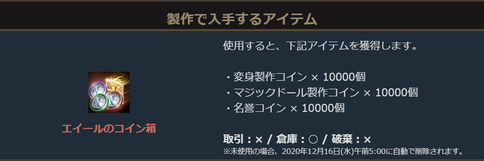 ※一部アイテムは未使用の場合、一定期間が経過すると自動で削除されます。詳しくは各アイテムの詳細をご確認ください。