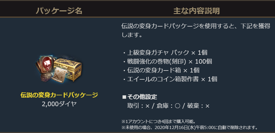 伝説級の変身が狙える、変身カードの取得に便利なパッケージです。