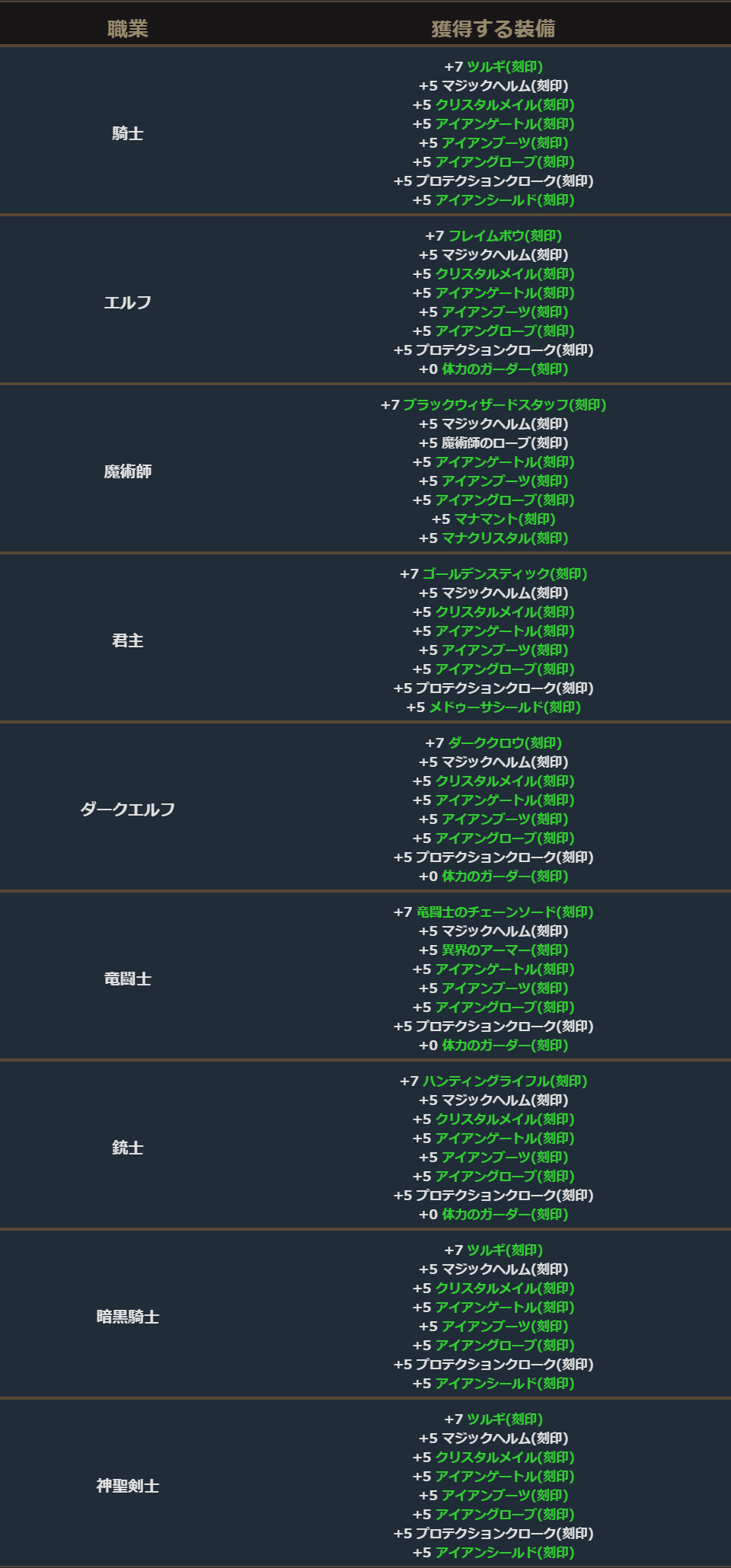 各種パンドラの装備箱から各職業ごとに獲得できる装備は以下となります。