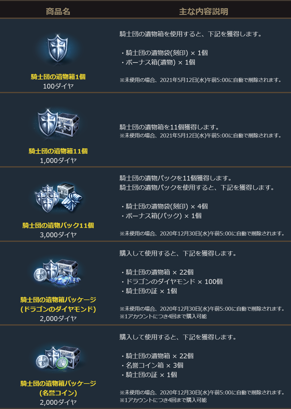 ※騎士団の証は、「騎士団の遺物パッケージ(ドラゴンのダイヤモンド)」「騎士団の遺物パッケージ(名誉コイン)」から、合計で最大8個まで入手することができます。