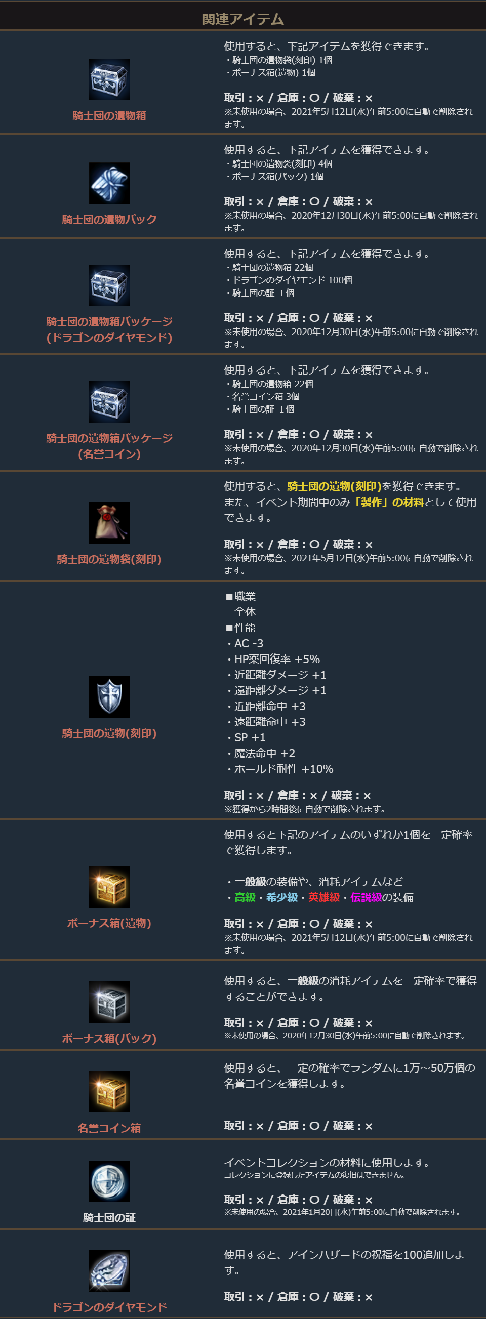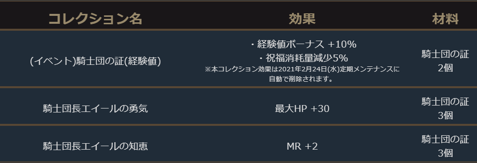 ※「(イベント)騎士団の証(経験値)」の有効日は2021年2月24日(水)定期メンテナンス終了時までとなっておりますのでご注意ください。