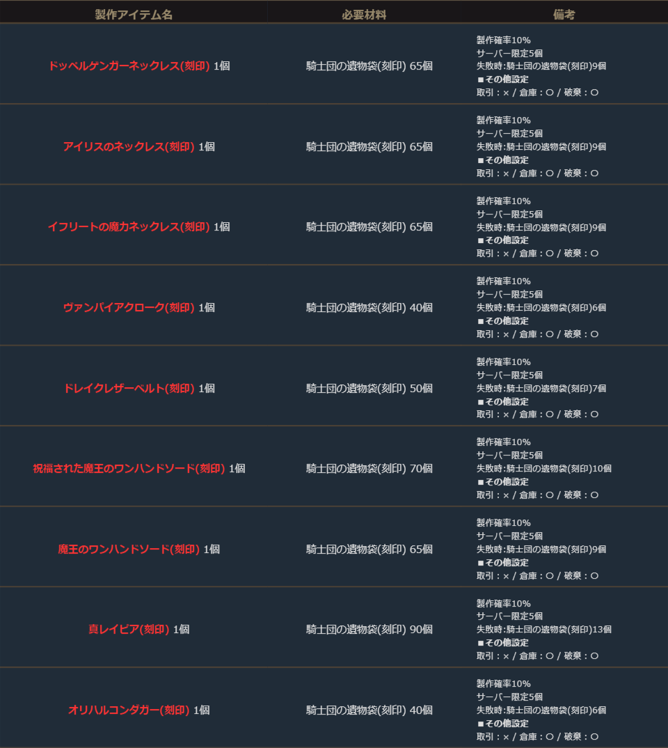 以下のアイテムについて製作可能数を「サーバー限定5個」に修正いたしました。・ドッペルゲンガーネックレス(刻印)