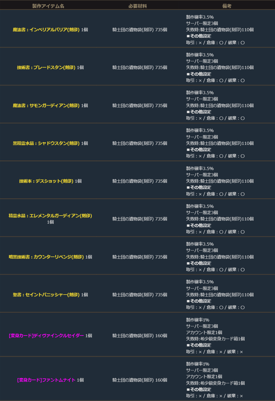 ※サーバー数量限定の製作アイテムは、各サーバーで製作できる数量に上限があります。