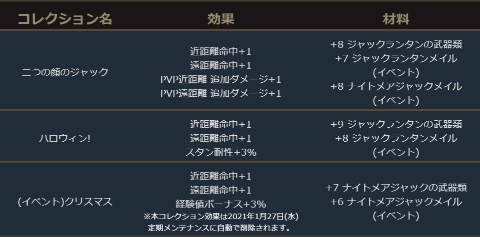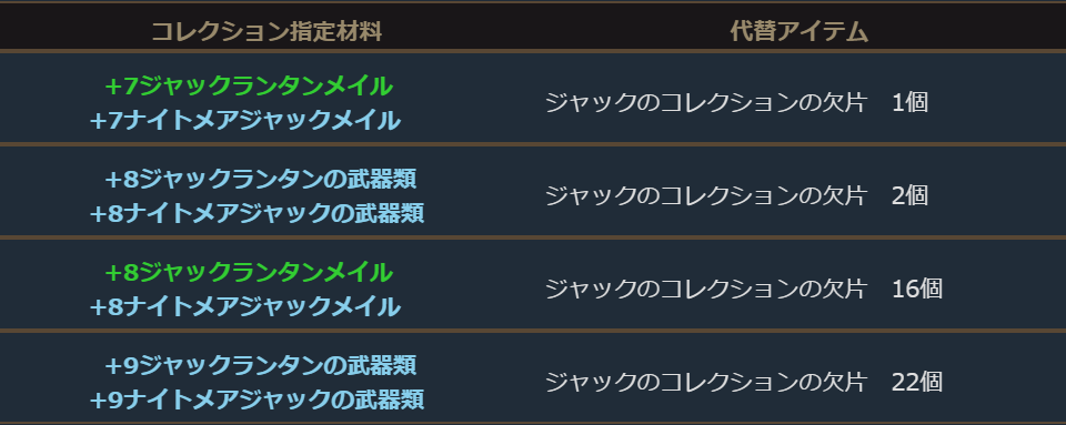 ジャックのコレクションの欠片は、下記のイベントコレクションの代替材料として使用可能です。