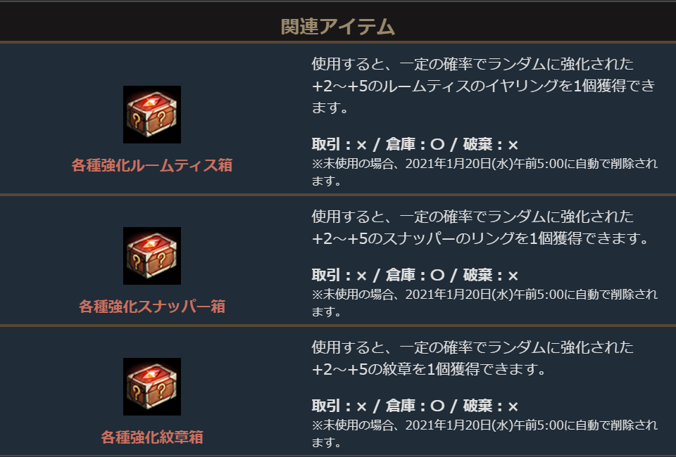 ※一部アイテムは未使用の場合、一定期間が経過すると自動で削除されます。詳しくは各アイテムの詳細をご確認ください。