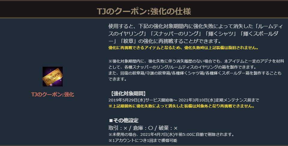 TJのクーポン:強化は、対象期間内に強化失敗した「ルームティスのイヤリング」「スナッパーのリング」「輝くシャツ」「輝くスポールダー」「紋章」の強化に再挑戦できる特別なアイテムです。