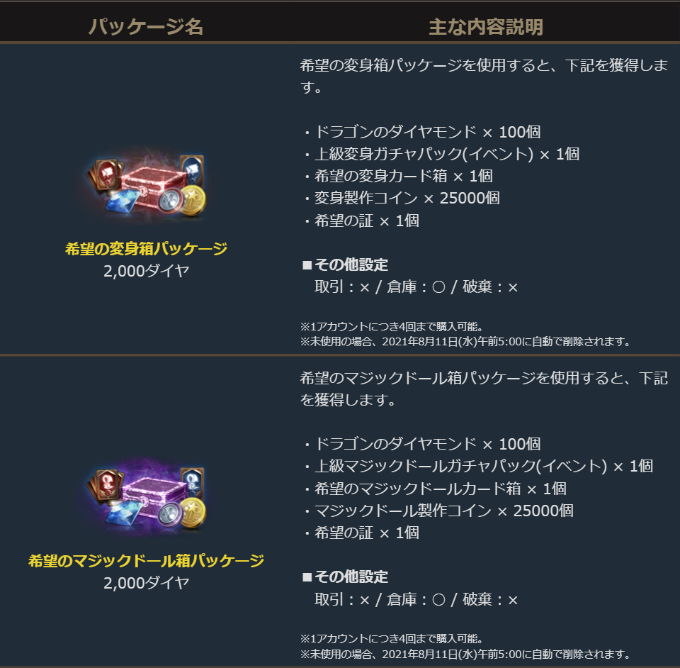 2021年7月21日より、ゲーム内ショップで「希望のパッケージ」の販売を開始しました。