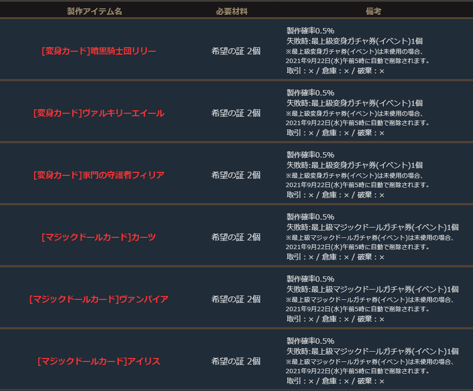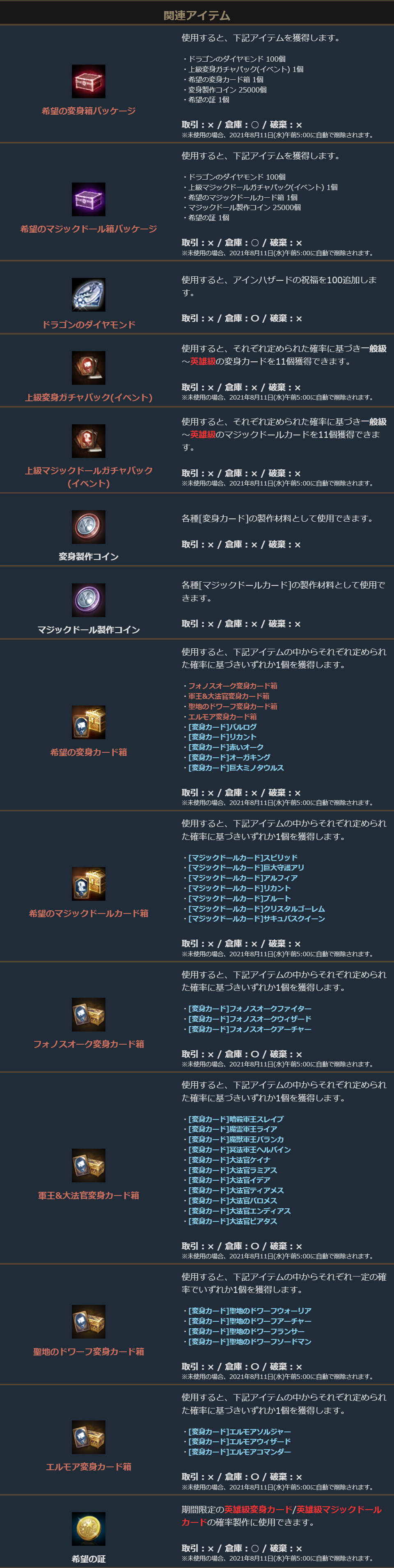 希少級カードが獲得できるアイテムや英雄級カードの製作に挑戦できるアイテムなど、変身やマジックドールの入手に便利なパッケージです。