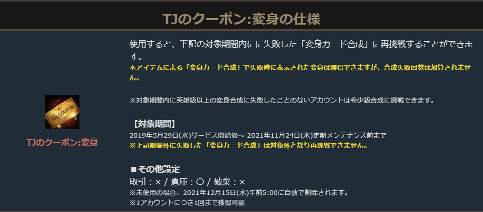 TJのクーポン:変身は、対象期間内に合成失敗した最高等級の変身カードの合成に再挑戦できる特別なアイテムです。